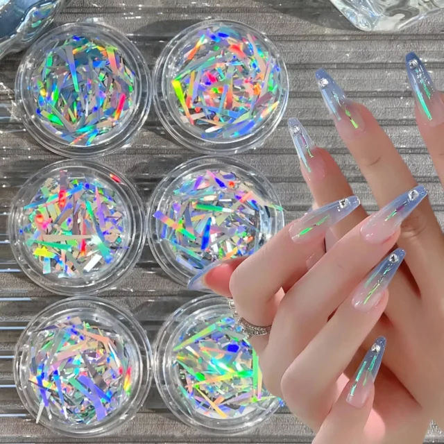 Give your nails a dazzling makeover with these Holographic Aurora Nail Stickers. Designed to catch the light with a stunning aurora and laser effect, these colorful flakes add an eye-catching dimension to any manicure. Made from premium cellophane and plastic, each box contains delicate, irregular-shaped flakes that mimic the look of shattered glass for a unique, sparkling effect. Perfect for DIY nail enthusiasts and professional salons, these stickers let you create everything from subtle shimmer to bold, holographic designs.
