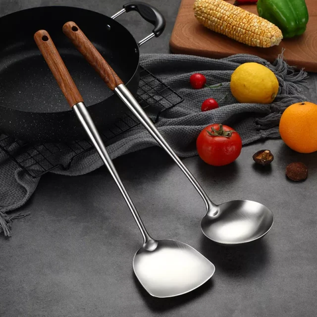 Upgrade your cooking experience with this high-quality stainless steel kitchen tool set, crafted for both style and function. This set includes a sturdy wok spatula and soup ladle, perfect for stirring, scooping, and serving. Designed with a solid wooden handle, each tool feels comfortable to hold, is scald-proof, and non-skid, ensuring safe and precise handling. Ideal for everyday cooking, this set brings a touch of elegance and durability to your kitchen.