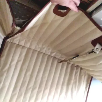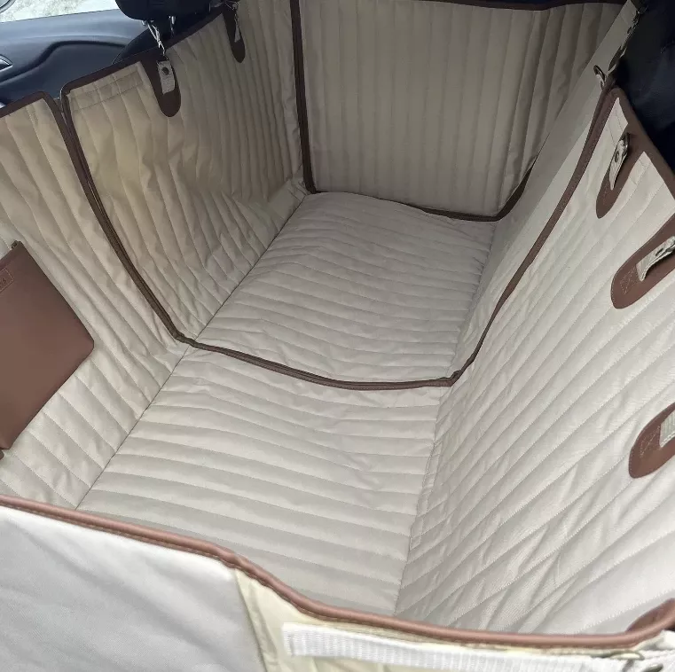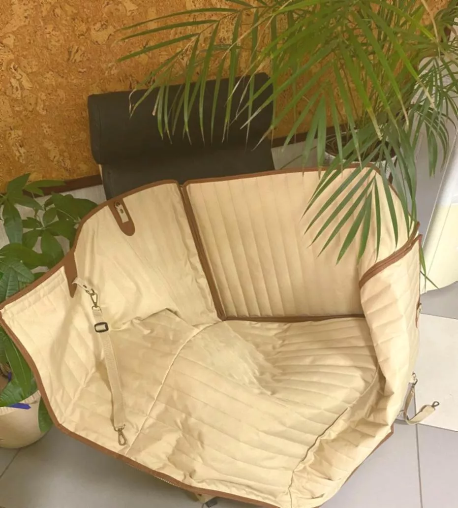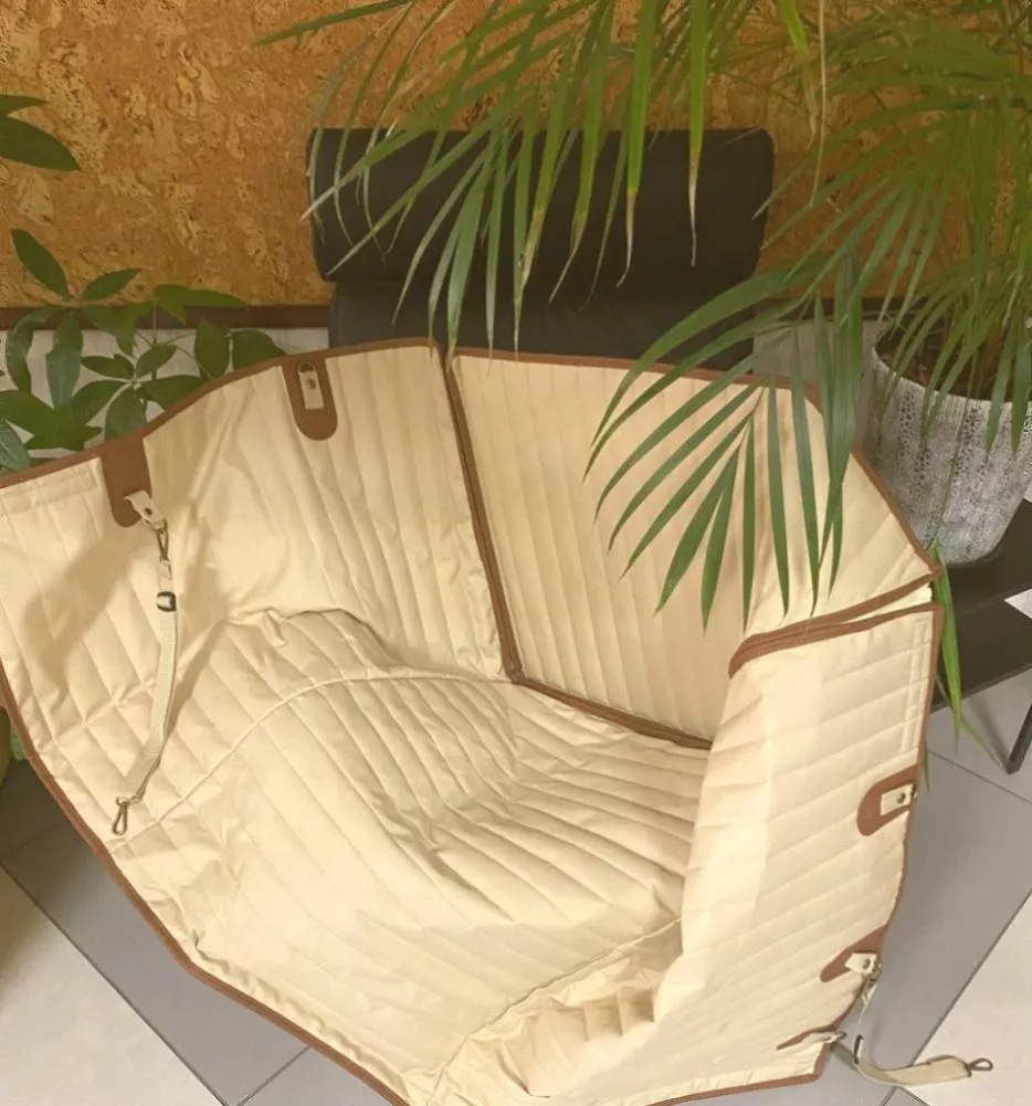 Featuring our branded beige and brown colors, this car hammock includes leather accents and a sleek geometric pattern. It integrates seamlessly into any car interior, offering protection with a stylish touch.